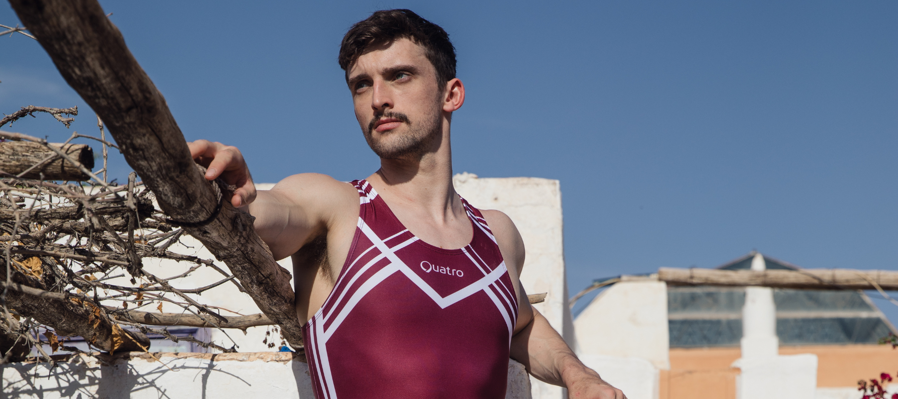 The Drive men’s leotard blends sleek functionality with athletic style. Designed in lightweight sublimated lycra, it features a bold burgundy and white color palette, enhanced by a modern wraparound pattern. The racerback cut and boxer style ensure no bunching and maximum comfort, ideal for intense training or competition. Subtle mesh panels at the back provide breathability, while the clean design showcases Quatro’s signature craftsmanship.