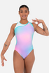 Step into a world of colour and energy with the Aura gymnastics leotard! Featuring a beautiful ombre effect in mint, marshmallow, and bubblegum sublimated lycra, this girl's leotard is a true statement piece. White lycra side panels and shoulder accents add a fresh contrast, while mint binding and trim complete the playful look. The asymmetric back design, with a sweeping shoulder strap crossing over thin lycra straps, gives this leotard a unique flair. Finished with scattered AB and clear stones, and a cluster of stones around the curved side panels, Aura sparkles with every move.