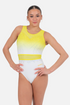 The Elegance leotard is the perfect blend of elegance and performance, designed to make gymnasts shine on the floor. Featuring a white lycra body with a sweetheart-shaped bodice crafted from white and yellow sublimated lycra, this leotard radiates sophistication. The yellow sublimated mesh shoulders offer a soft and airy feel, while the round neck at the front and V-neck with a delicate cutout at the back add timeless style. Sparkling AB stones adorn the bodice and shoulders in an intricate pattern, creating a dazzling effect under the lights. A sublimated belt detail at the waistline completes the look, enhancing the silhouette with a touch of refinement.