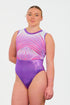 This stunning girls gymnastics leotard by French gymnast Lorette Charpy is a true masterpiece, combining beautiful colours and intricate design to make a statement. The cherry, grape, and white sublimated lycra bodice, create a striking visual contrast. The high neckline features a sleek clasp closure, while the circular cut-out in the back adds an elegant touch of modern flair. Grape mystique binding on the neck and a beautifully appliquéd belt detail adorned with standard and AB stones create a dynamic effect, with the stones radiating from the neckline for an eye-catching finish. Designed for the French National Championships, the design incorporates symmetrical, curved lines that fan out gracefully, offering an intricate pattern that reflects the precision and artistry of elite gymnastics. Perfect for gymnasts who want to showcase their strength and elegance, the Merveille leotard is made to stand out on the floor.