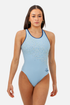 Turn it around and the whole design becomes something special. The back features a clean triangular cut out with a set of slim navy straps that cross in a unique pattern. It feels modern, playful and totally standout without losing that soft, cool vibe. This is a leotard that looks cute, feels effortless and brings a little sparkle to every session.