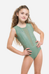 Designed by Olympic champion Nina Derwael, Fern channels calm confidence and graceful artistry. The khaki lycra body creates a beautifully natural base, enhanced by khaki mesh panels that are lined through the centre bodice and around the waist for subtle coverage and comfort.