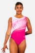 - Cherry, bubblegum, and white sublimated lycra bodice in a delicate feather pattern.